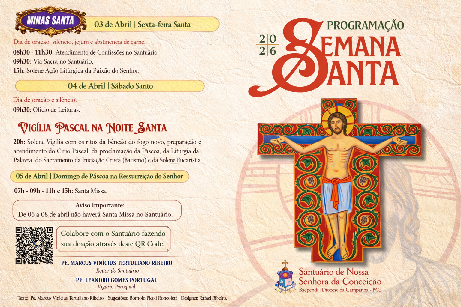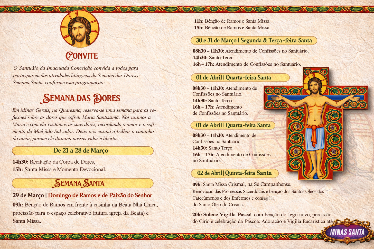 A Semana Santa é um dos momentos mais importantes da tradição religiosa e cultural de Baependi, reunindo fiéis, visitantes e peregrinos em celebrações marcadas pela fé, devoção e pelas antigas tradições do interior de Minas. No Santuário de Nossa Senhora da Conceição, a programação especial convida a comunidade e os turistas a vivenciar intensamente este período litúrgico que recorda a paixão, morte e ressurreição de Jesus Cristo. As atividades têm início com a Semana das Dores, de 21 a 28 de março, período tradicional de reflexão na quaresma mineira, dedicado às dores de Maria. Durante esses dias acontecem momentos devocionais, com recitação da Coroa das Dores às 14h30 e Santa Missa às 15h, proporcionando um clima de oração e preparação espiritual para a Semana Santa. No dia 29 de março, Domingo de Ramos e da Paixão do Senhor, os fiéis se reúnem às 9h para a Bênção de Ramos em frente à casinha da Nhá Chica, seguida de procissão até o espaço celebrativo e celebração da Santa Missa. Também acontecem missas com bênção de ramos às 11h e 15h, marcando o início solene da Semana Santa. Nos dias 30 e 31 de março, Segunda e Terça-feira Santa, a programação inclui confissões no Santuário, Santo Terço às 14h30 e Santa Missa às 15h, proporcionando momentos de recolhimento e preparação espiritual. Já no dia 1 de abril, Quarta-feira Santa, além das confissões e da Santa Missa, ocorre às 19h a tradicional procissão com a imagem de Nossa Senhora das Dores, uma manifestação de fé profundamente enraizada na cultura religiosa da região. A programação segue com a Quinta-feira Santa, 2 de abril, quando acontece a Santa Missa do Crisma na Catedral da Diocese da Campanha, com a renovação das promessas sacerdotais e a bênção dos santos óleos. À noite inicia-se o Sagrado Tríduo Pascal, com a Missa da Ceia do Senhor às 19h30, rito do lava-pés e vigília eucarística até às 23h. Na Sexta-feira Santa 3 de abril, dia de oração, silêncio e jejum, acontecem confissões pela manhã, a Via-Sacra às 9h30 e, às 15h, a Ação Litúrgica da Paixão do Senhor, momento central da recordação da morte de Cristo. O Sábado Santo 4 de abril é marcado por um clima de espera e oração, com o Ofício das Leituras às 9h30 e, às 20h, a solene Vigília Pascal, considerada a celebração mais importante do calendário cristão, com a bênção do fogo novo, o acendimento do Círio Pascal e a celebração da ressurreição. Encerrando a programação, o Domingo de Páscoa 5 de abril celebra a ressurreição do Senhor, com missas às 7h, 9h, 11h e 15h, reunindo a comunidade e visitantes em um momento de alegria e renovação da fé. A Semana Santa em Baependi é uma experiência que une espiritualidade, tradição e cultura mineira, atraindo visitantes que desejam conhecer de perto as manifestações religiosas da cidade, marcada pela devoção e pela história ligada à Beata Nhá Chica. Durante esse período, o município se transforma em um verdadeiro espaço de fé e acolhimento, fortalecendo suas tradições e oferecendo aos turistas uma vivência única da religiosidade popular brasileira.