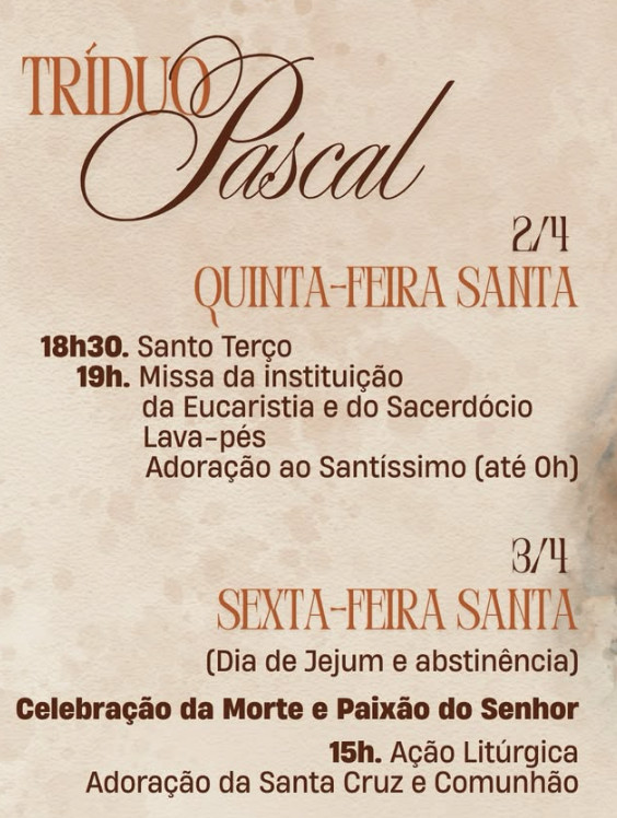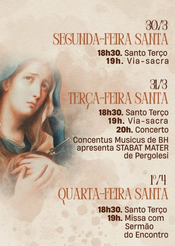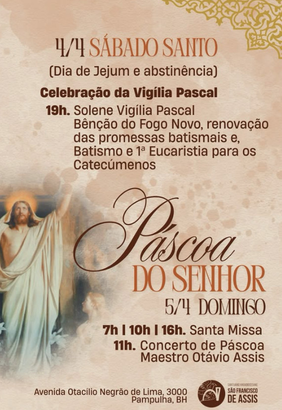 O Santuário Arquidiocesano São Francisco de Assis, na Pampulha, convida fiéis e visitantes a vivenciarem a Semana Santa 2026, entre os dias 29 de março e 5 de abril, em uma jornada marcada por fé, reflexão e espiritualidade, conduzindo à celebração da Páscoa da Ressurreição. A programação tem início no Domingo de Ramos e da Paixão do Senhor, 29 de março, com missas às 7h e às 18h no interior do santuário, além da tradicional concentração, procissão e missa com bênção dos ramos às 10h, na praça. Nos dias seguintes, segunda e terça-feira, 30 e 31 de março, acontecem o terço às 18h30 e a Via-Sacra às 19h. Na quarta-feira santa, 1 de abril, a programação inclui terço às 18h30 e missa às 19h com o Sermão do Encontro, reunindo as imagens do Senhor dos Passos e de Nossa Senhora das Dores. O Tríduo Pascal tem início na quinta-feira santa, 2 de abril, com terço às 18h30 e a Missa da Ceia do Senhor às 19h, seguida pelo rito do Lava-pés e adoração ao Santíssimo até a meia-noite, celebrando a instituição da Eucaristia e do sacerdócio. Na sexta-feira santa, 3 de abril, dia de jejum e abstinência, a programação conta com Via-Sacra às 14h e, às 15h, a Ação Litúrgica da Paixão do Senhor, com proclamação da Paixão, adoração da Santa Cruz e Sagrada Comunhão. No sábado santo, 4 de abril, às 19h, será celebrada a Solene Vigília Pascal, com bênção do fogo novo e renovação das promessas batismais. Encerrando a programação, o Domingo da Ressurreição, 5 de abril, contará com missas às 7h, 10h e 16h, além de um Concerto de Páscoa às 11h, celebrando com alegria a vitória da vida. Ao longo de toda a semana, o santuário se torna um espaço de encontro, oração e renovação espiritual, acolhendo a comunidade em um dos momentos mais significativos do calendário cristão.