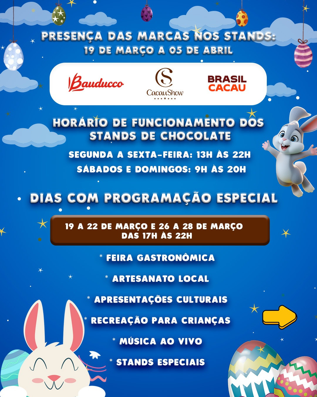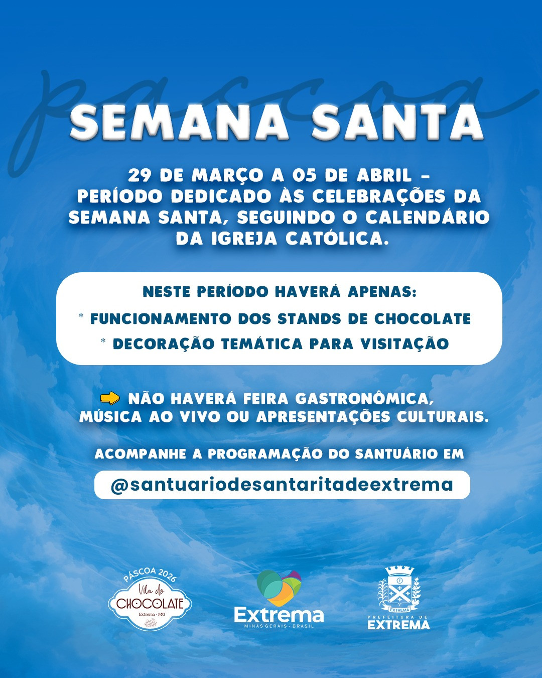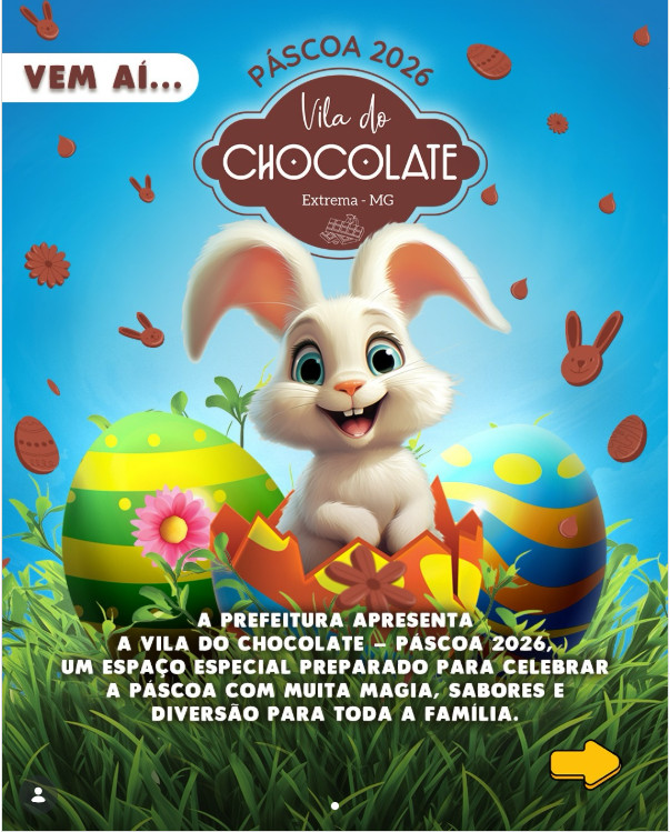 Pela primeira vez, o município de Extrema realizará uma celebração especial de Páscoa na Praça Presidente Vargas, que será transformada em uma Vila do Chocolate. Promovida pela Secretaria de Turismo, a iniciativa acontecerá de 19 de março a 5 de abril e contará com decoração temática e diversas atrações voltadas ao público infantil e às famílias. O projeto inclui a criação de um espaço dedicado à vivência do clima pascal, onde os visitantes poderão encontrar e interagir com o Coelhinho da Páscoa. A programação também contará com gastronomia temática, artesanato local, apresentações culturais, recreação infantil e estandes de vendas. Entre os destaques, estarão produtos e lançamentos de grandes marcas do setor de chocolates, como Bauducco, Brasil Cacau e Cacau Show, que oferecerão ovos de Páscoa, itens temáticos e novidades da temporada. As atividades acontecerão ao longo de três semanas, sempre de quinta a domingo, das 17h às 22h, nas seguintes datas: de 19 a 22 de março, de 26 a 29 de março e de 2 a 5 de abril. A proposta é reunir moradores e visitantes em um ambiente de lazer e celebração, além de estimular o turismo e o comércio local durante o período festivo.