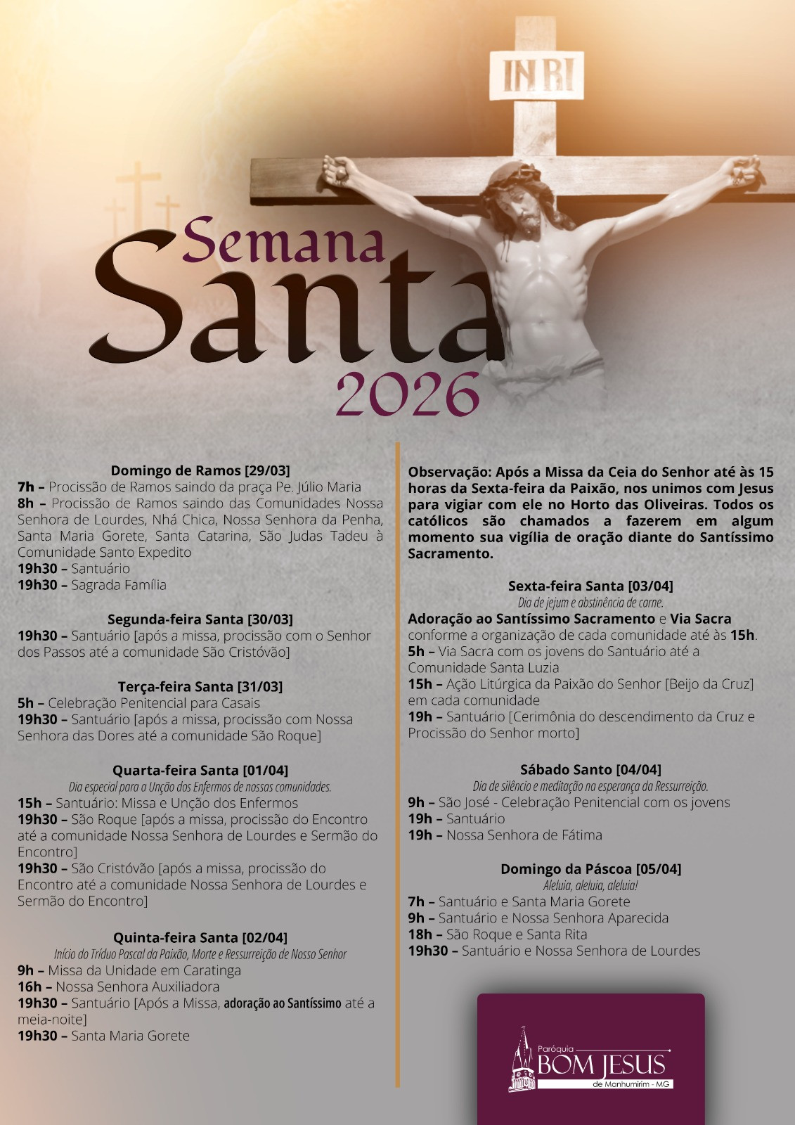 O evento vai começará no dia 29 de março de 2026 á 05 de abril de 2026 com missas em diversos horários na Igreja Matriz do Bom Jesus, atraindo um grande numero de fieis da cidade e região se tornando um evento Religioso de grande relevância para nosso Turismo Religioso onde os fies podem visitar uns de nossos Patrimônios Culturais que são a Igreja Matriz do Bom Jesus, Seminário e Cruzeiro ou Mirante Genésio Benardino onde se tem visão de boa parte da cidade de Manhumirim.