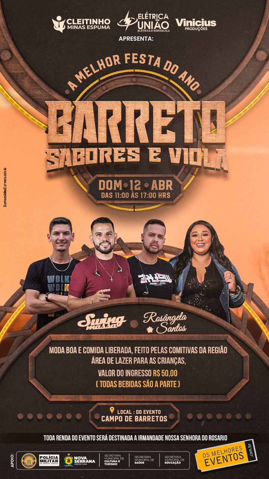 O Barreto Sabores e Viola é uma celebração das tradições culturais que fazem parte da identidade de Minas Gerais. A música de viola, símbolo da cultura sertaneja e da vida no interior, ganha destaque no evento como forma de valorizar artistas, preservar costumes e fortalecer as raízes culturais da região. Além de promover a cultura, o evento também se destaca como uma importante iniciativa de turismo e geração de renda para a comunidade. Ao reunir visitantes, moradores e amantes da música sertaneja, o Barreto Sabores e Viola movimenta a economia local, incentiva a gastronomia tradicional e fortalece eventos comunitários como atrativos turísticos do município. A programação musical promete animar o público ao longo de todo o dia. O evento contará com apresentações de artistas locais, valorizando os talentos da região e abrindo a festa com muita música sertaneja e moda de viola. Na sequência, o grupo Swing Massa traz animação e ritmo para embalar o público durante a confraternização. Encerrando a programação, a cantora Rosângela Santos sobe ao palco com um grande show, garantindo um final de tarde especial repleto de música e emoção. Mais do que uma festa, o Barreto Sabores e Viola representa um momento de encontro, tradição e solidariedade, demonstrando como a cultura e o turismo podem caminhar juntos para valorizar as comunidades e criar oportunidades de desenvolvimento local.